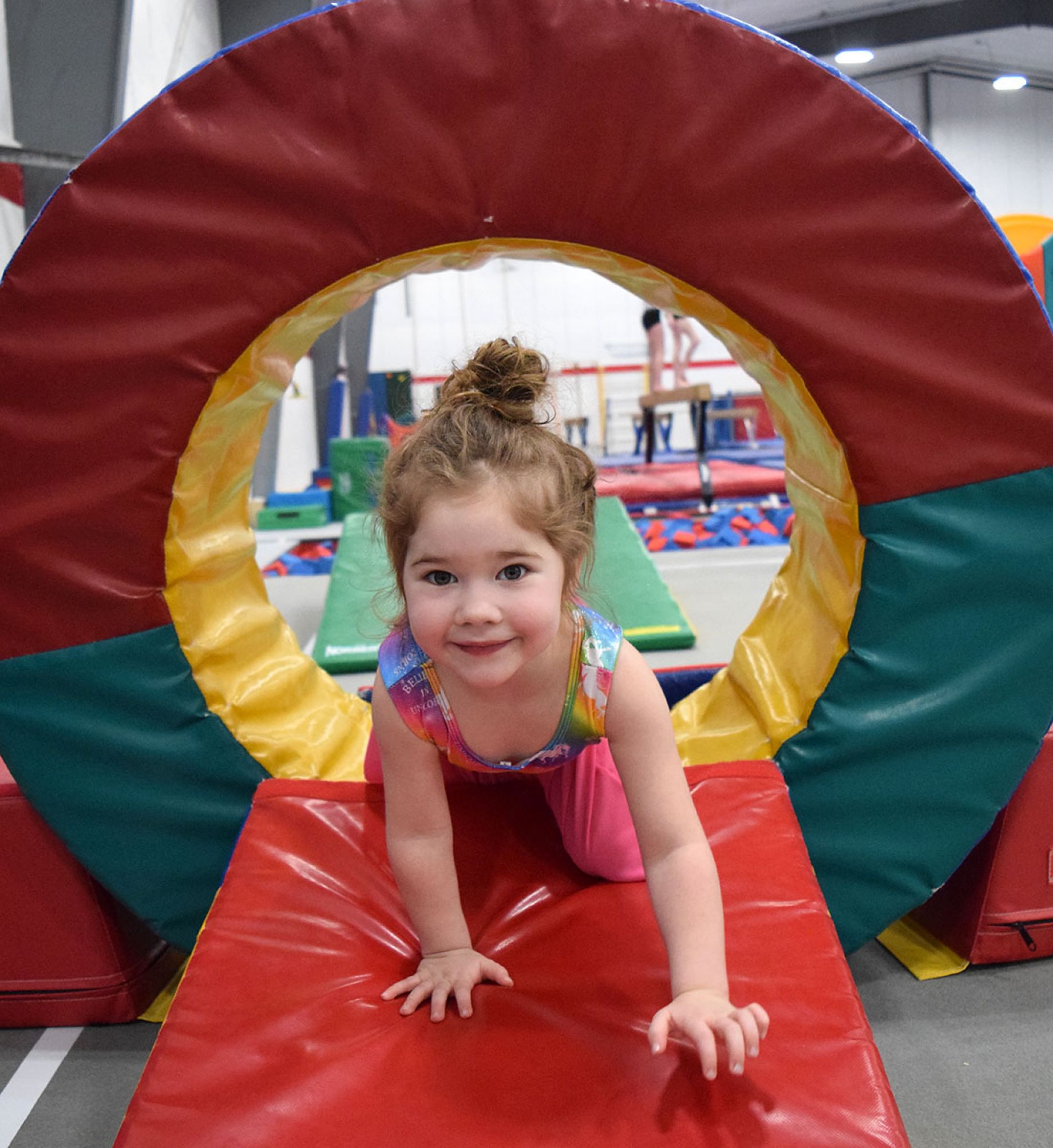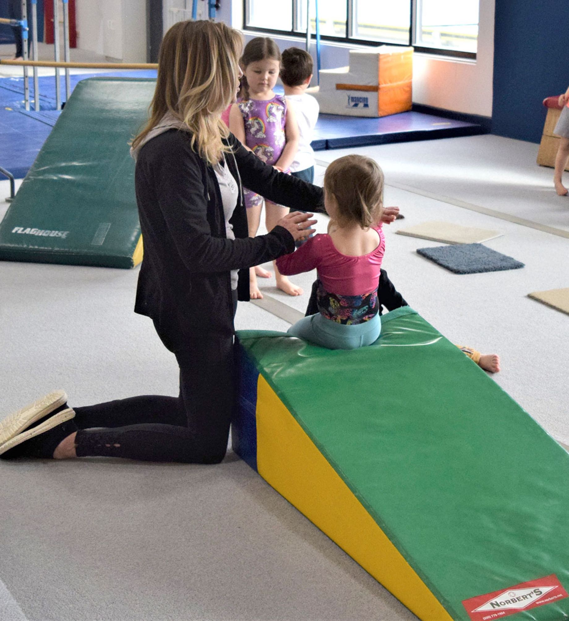 For children ages 3 & 4 yrs. The class is 45 min long and children are introduced to beginning skills in tumbling and the gymnastics events. We also explore a variety of other locomotor skills. Emphasis is on exposure, not mastery of skills at this level.