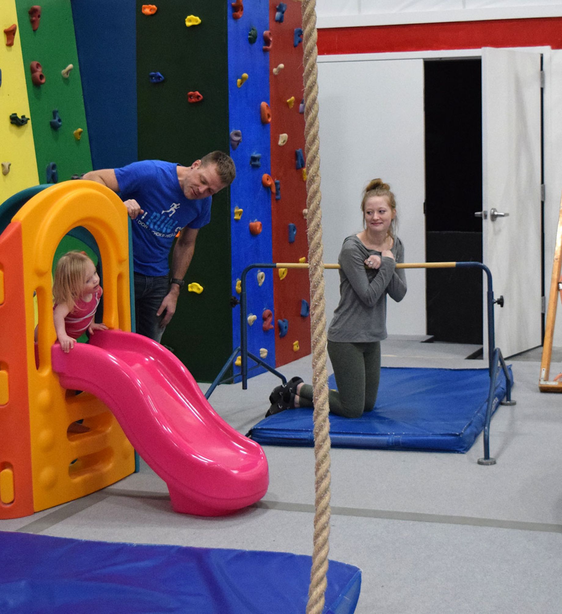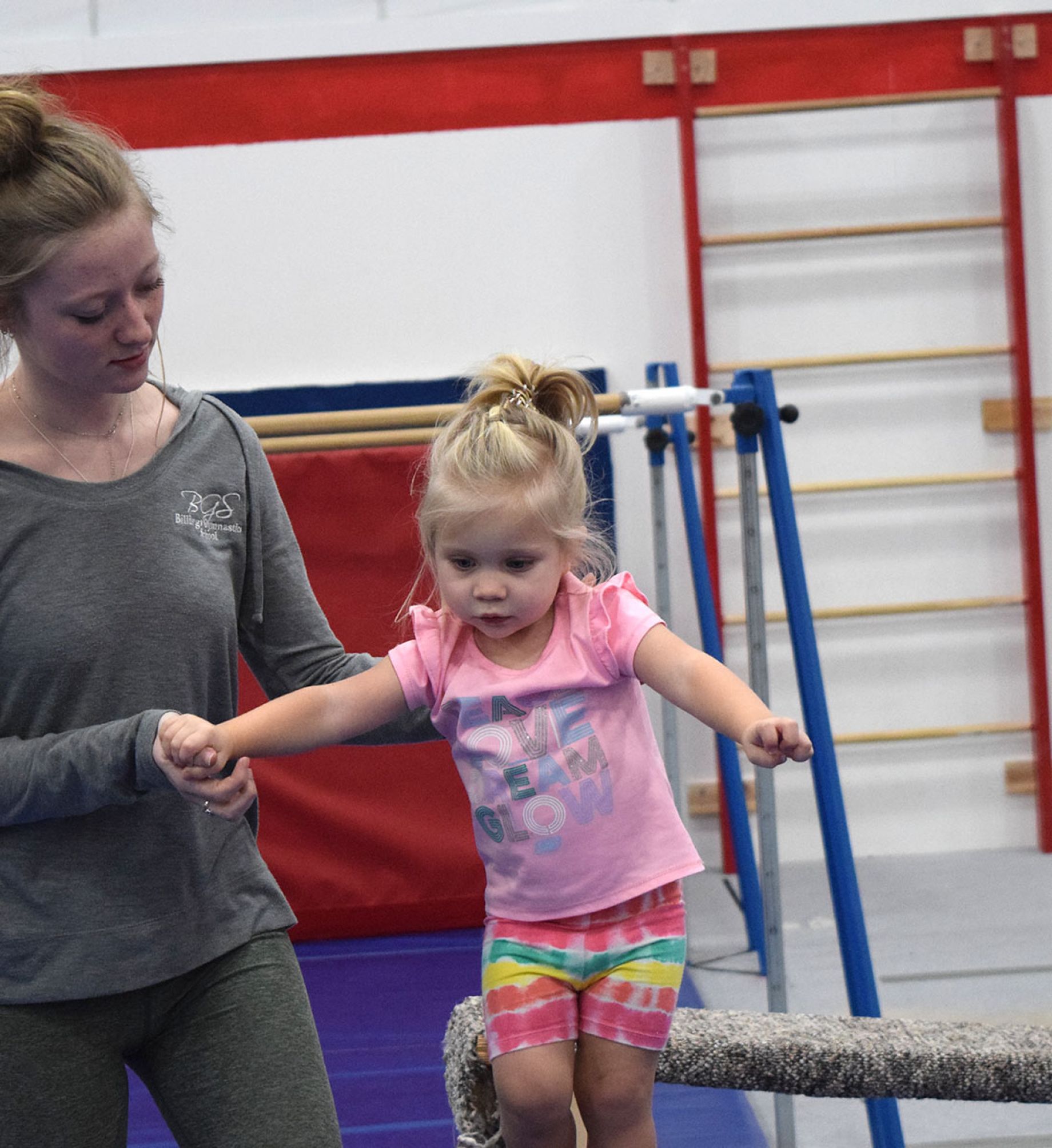 Children age 18 months to 36 months come to this 45 min class with an adult. Children learn beginning gymnastics and locomotor skills through movement and exploration in this fun-filled class. One adult participant is required per student for this class.